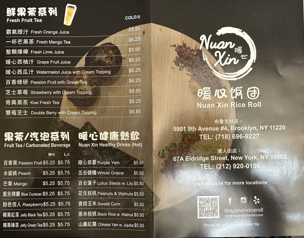 Nuan Xin Rice Roll, located in New York City, offers a delicious menu of Chinese rice rolls with a variety of fillings. From the Sweet Rice Roll with black sesame and peanut to the Special Rice Roll with lettuce and pork floss, each dish is packed with flavor and texture. The Grilled Taiwan Sausage and Kimchi sides provide additional options to complement your meal. Customers have praised the freshness and quality of the dishes, with favorites like the roast duck rice roll and eel rice roll standing out. The cozy ambiance and fast service make it a popular spot for a quick and satisfying meal. With a range of vegetarian options and unique flavors, Nuan Xin Rice Roll is a must-visit for rice roll enthusiasts looking for authentic and affordable Chinese cuisine.